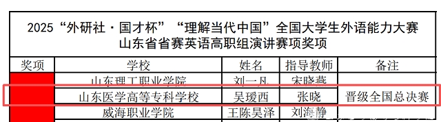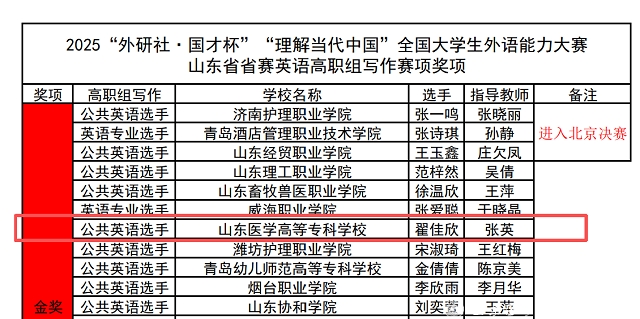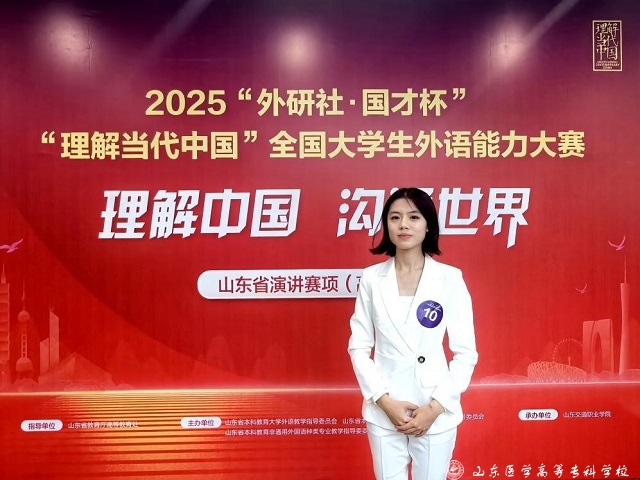11月1日,2025“外研社·国才杯”“理解当代中国”全国大学生外语能力大赛山东省省赛圆满结束。山东医学高等专科学校学子荣获2项金奖、2项铜奖、4项优胜奖。获得演讲比赛金奖的吴瑷西同学晋级全国决赛,这是我校在本项比赛中取得的最好成绩。